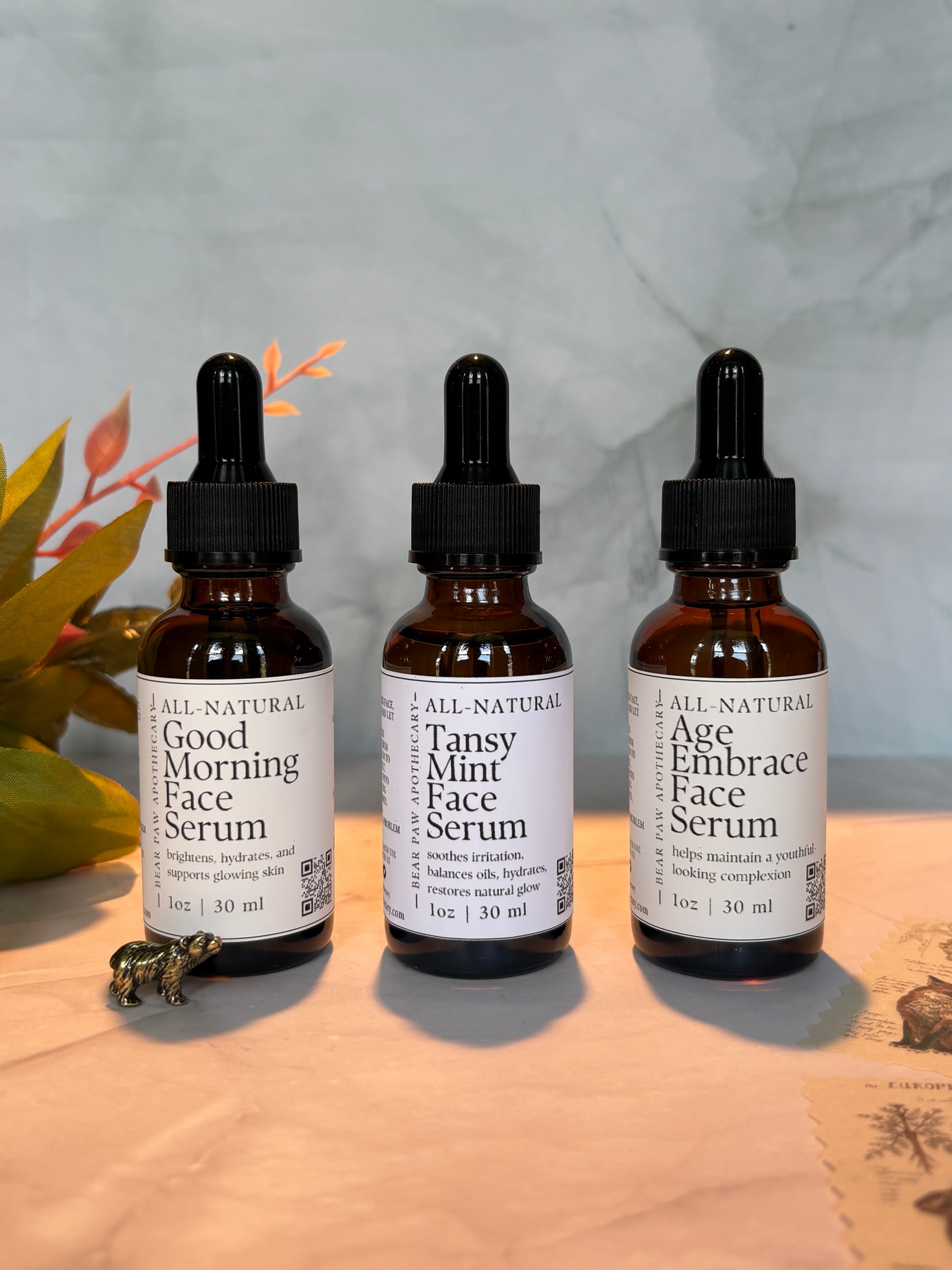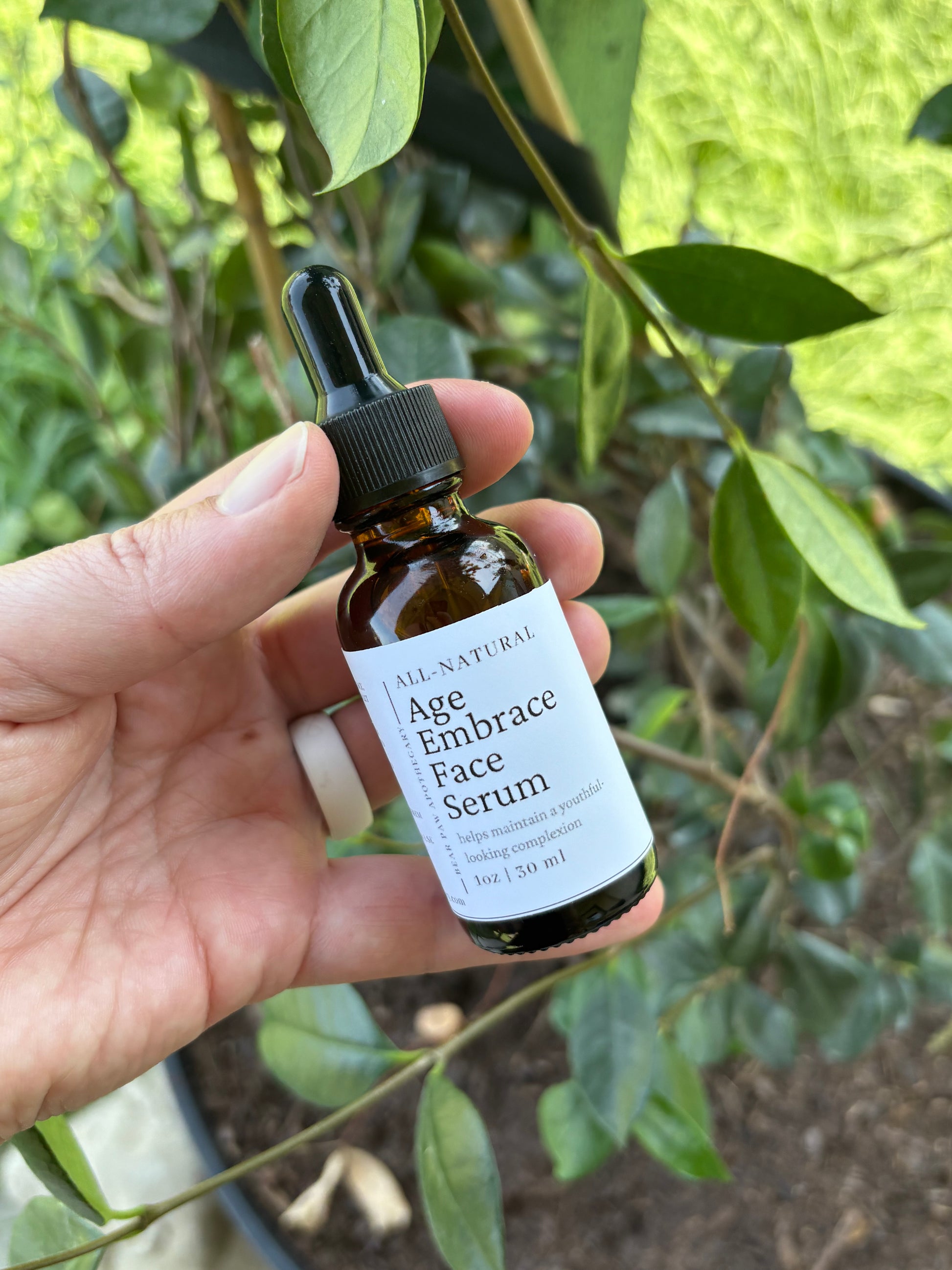 A restorative blend designed to support skin through the seasons of life. Age Embrace combines nutrient-rich botanicals and precious oils to help soften fine lines, improve elasticity, and encourage a radiant, even complexion. Infused with rosehip, moringa, and jojoba oils alongside extracts of comfrey, calendula, and arnica, this serum deeply nourishes while promoting repair and resilience. A gentle synergy of frankincense, geranium, and helichrysum essential oils adds skin-balancing properties and a naturally grounding aroma.