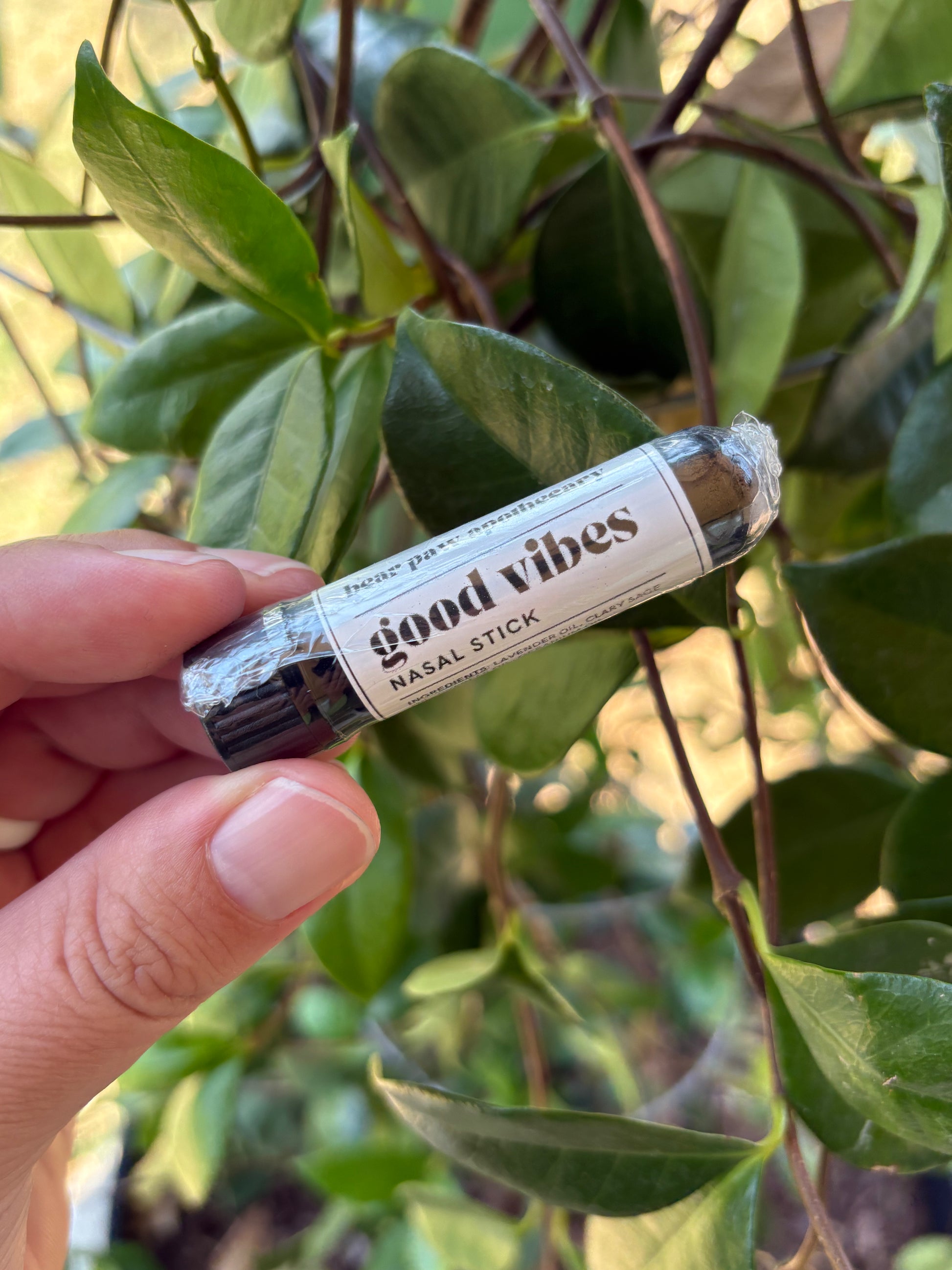 Experience a mood boost anytime, anywhere with the Good Vibes Nasal Stick by Bear Paw Apothecary. Simply inhale the natural aromatherapy blend to increase your vibe and promote positivity. Elevate your mood and mindset with this convenient nasal inhaler.