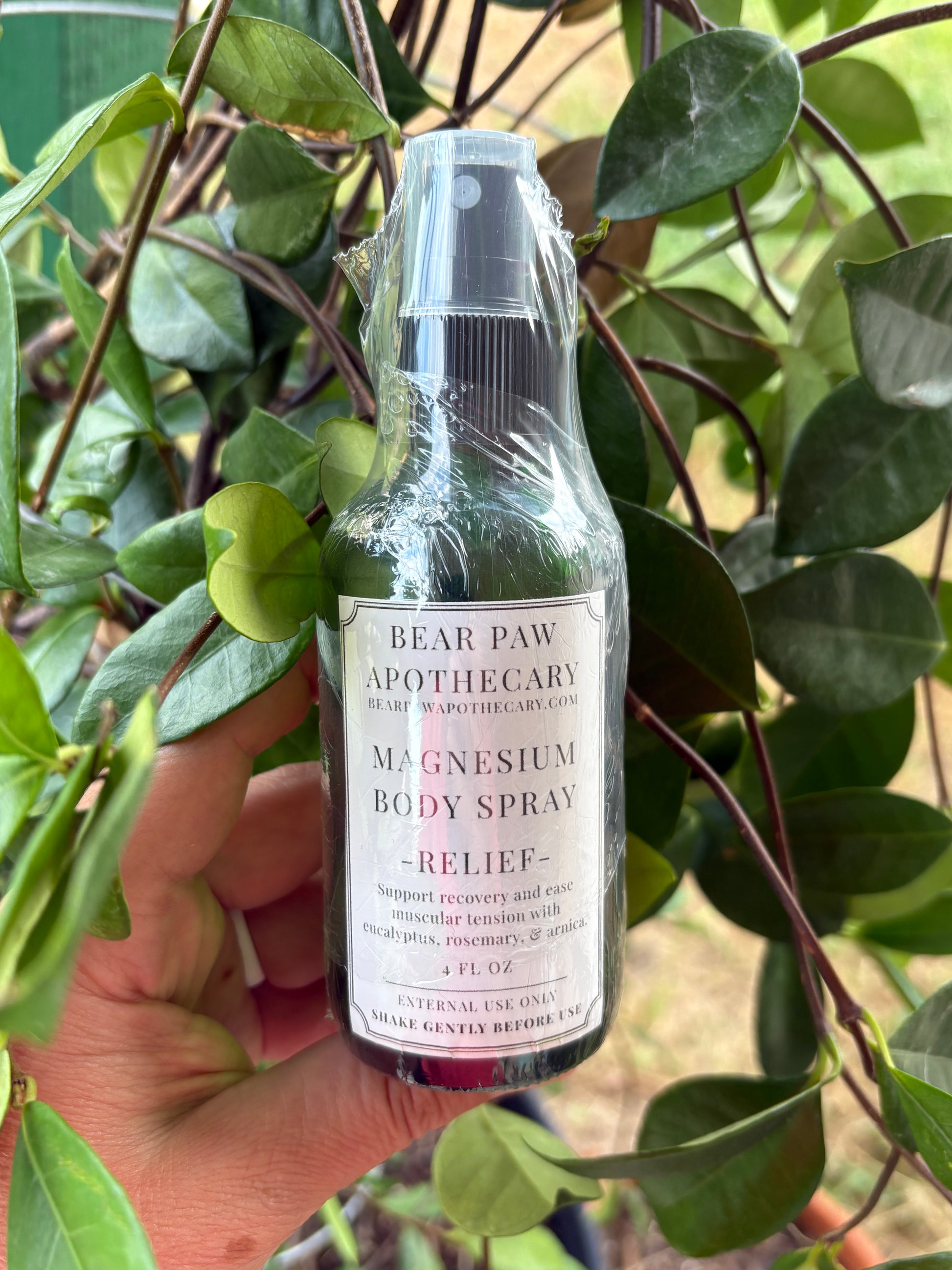 Ease tension and melt away muscle aches with this mineral-rich body spray, crafted to support recovery and reduce soreness. Infused with pure magnesium chloride, arnica, and a cooling blend of peppermint and eucalyptus essential oils, it delivers fast-acting relief to tired limbs, post-workout fatigue, or everyday tightness.